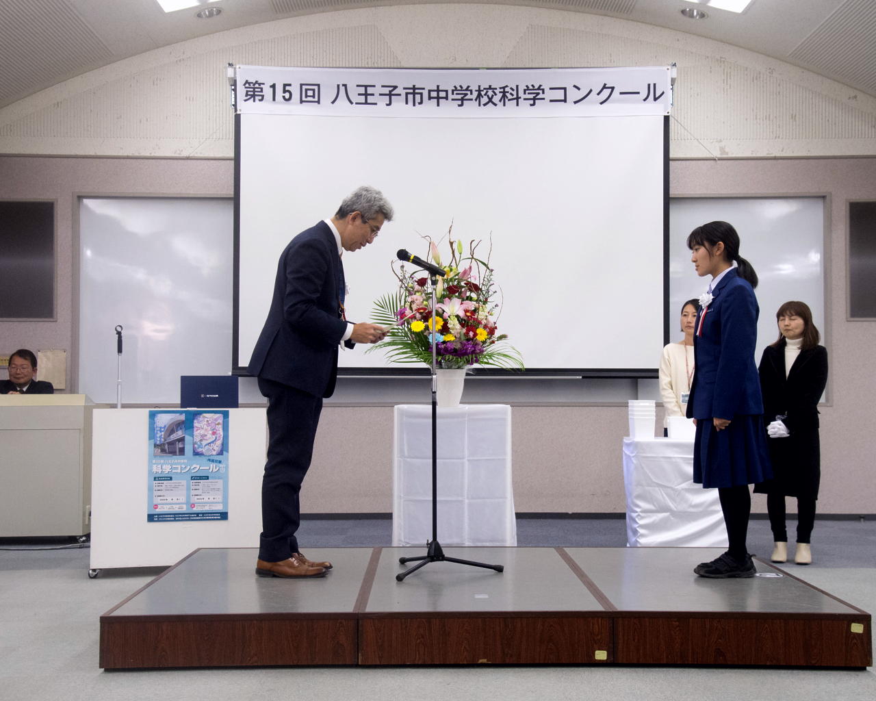 12月2日に八王子教育センターで開催された、第15回八王子市中学校科学コンクール発表会、表彰式に、伊藤真人、大井みさほ、奥田治之、西原 寛、佐々田博之、町田武生、和田 勝会員が出席しました。このコンクールは主催:八王子市教育委員会、八王子市立中学校PTA連合会、後援:八王子市立中学校長会、協賛:オリンパス株式会社、NPO法人SSISS(科学技術振興のための教育改革支援計画)で実施されたものです。今年度は久しぶりにポスター発表が復活し、口頭での発表と併せて行われました。参加者も人数の制限はあったようですが、父兄や教員などに拡大して開催されました。会場はセンター3階の大会議室です。