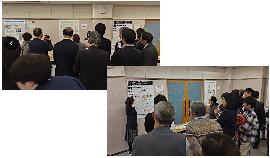 このコンクールでは、各校から選ばれた3点ずつの計93点の応募作品の中から最優秀賞、優秀賞各1件ならびに6件の奨励賞が選ばれています。各賞の受賞者やその研究題目などは八王子市立中学校PTA連合会のホームページをご参照ください。当日はこれら8件のポスターが会場に掲出され、奨励賞6件はポスターの前での発表、最優秀賞と優秀賞はプロジェクターを使っての口頭発表が行われました。奨励賞6件のポスター発表については、参加者が全てのポスター発表を聞くことができるようにスケジュールが工夫されていました。この6件には開催団体からそれぞれの賞が与えられたました。さらに、協賛団体からは副賞品が授与され、私どもSSISSからは小林憲正会員著の「生命と非生命のあいだ」(講談社ブルーバックス、2024年刊)が9名の生徒(1件の発表は2人のチーム)に贈呈されました。また、本イベントの次年度の告知に使われるポスターイラストも併せて採用作品が紹介され、ポスターイラスト賞として表彰されました。